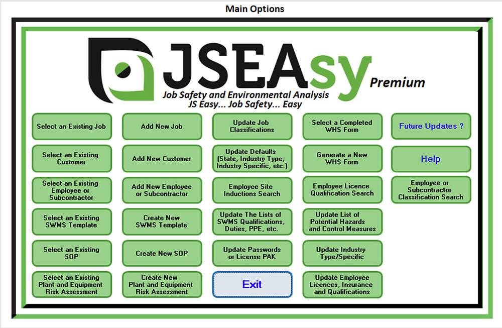 JSEAsy Premium, incorporates the JSEAsy SWMS and SOP software with all of our WHS/ OHS documentation and is all customised to suit your business as well as the legislation, Acts and regulators for your region. The premium version is a total WHS/ OHS management system.
